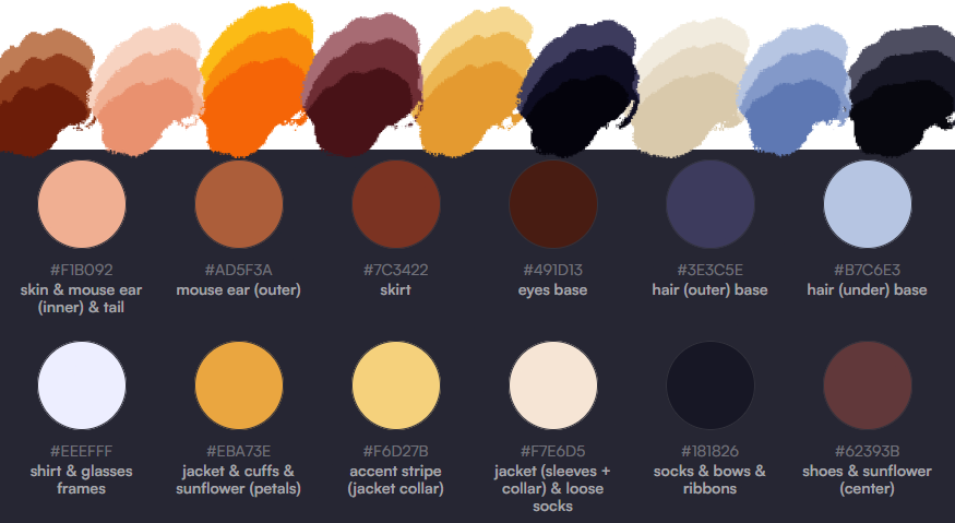 🌻 outfit is free to interpret however you want, mix & match, or make your own is OK🌻 chibi style note: sunflowers in mouse ears can be reduced to 1 or 2, but normal styles should always have 3 sunflowers🌻 I also have normal human ears🌻 round glasses sit low on my faceHika x OC Daina is highly encouragedNSFW works must always be marked/tagged/labeled for content warnings! Fetish work is strictly prohibited 🚫